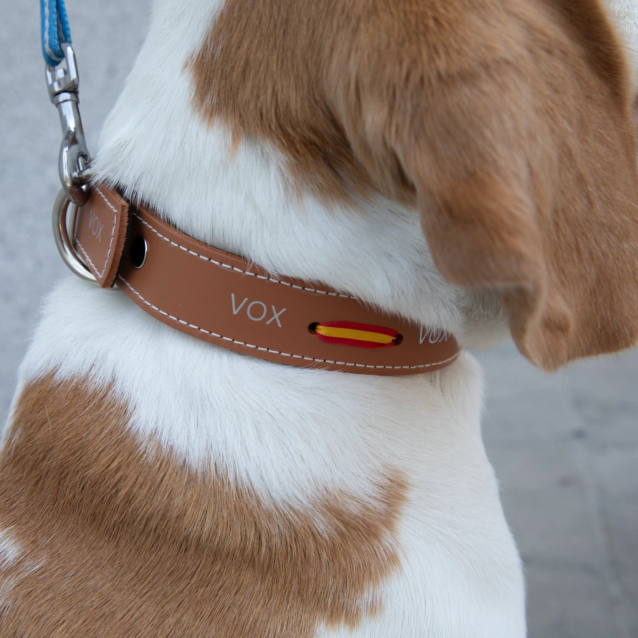 Collar marrón para perros, fabricado en España con piel natural de alta calidad. Incluye doble bandera cosida con detalle bordado. Resistente, duradero y diseñado para un uso cómodo y seguro.
