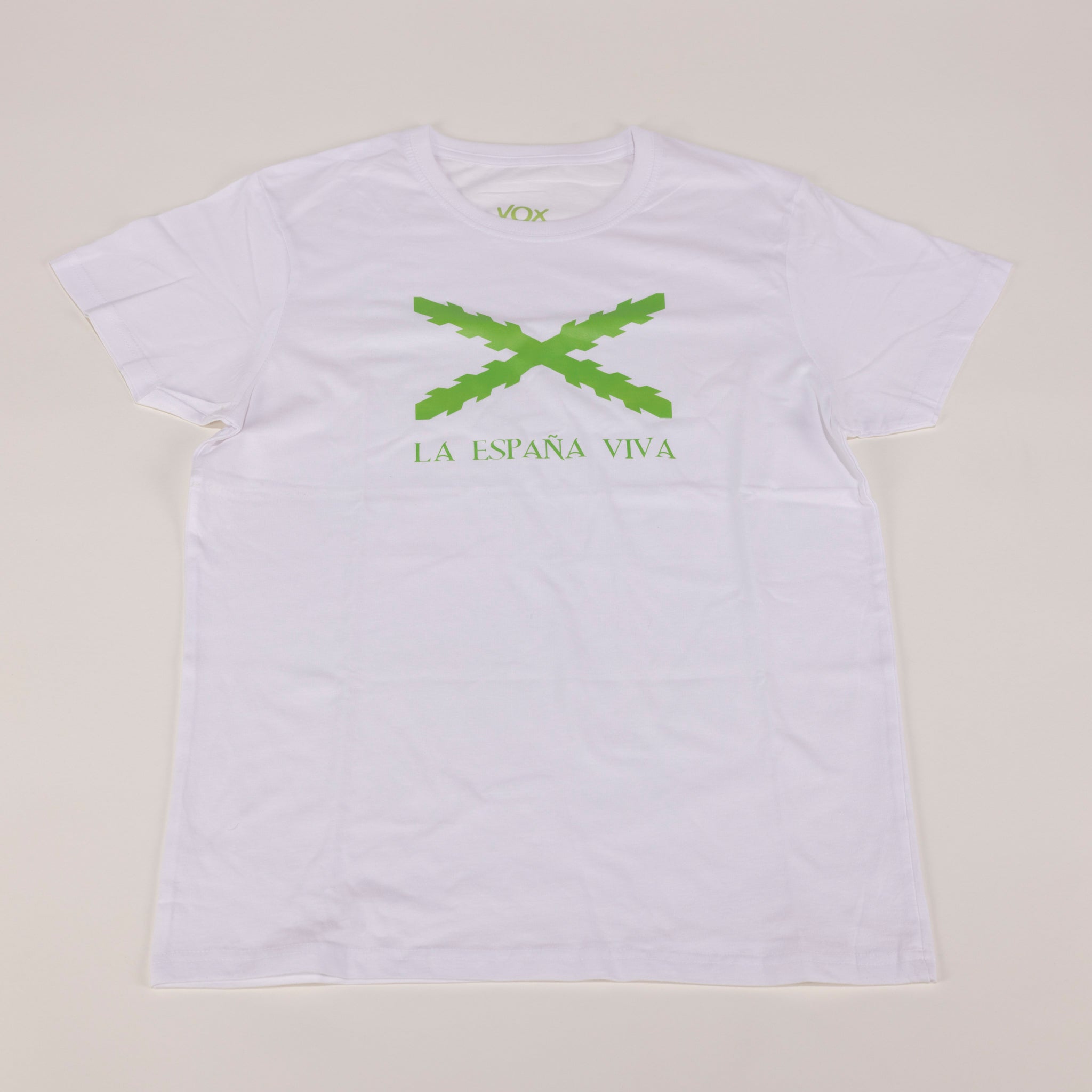 Camiseta blanca con cruz de borgoña en verde de algodón nacional 100% con confección en talleres españoles. Corte clásico y tejido de alta calidad.